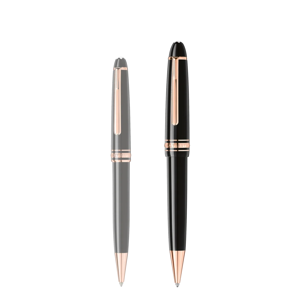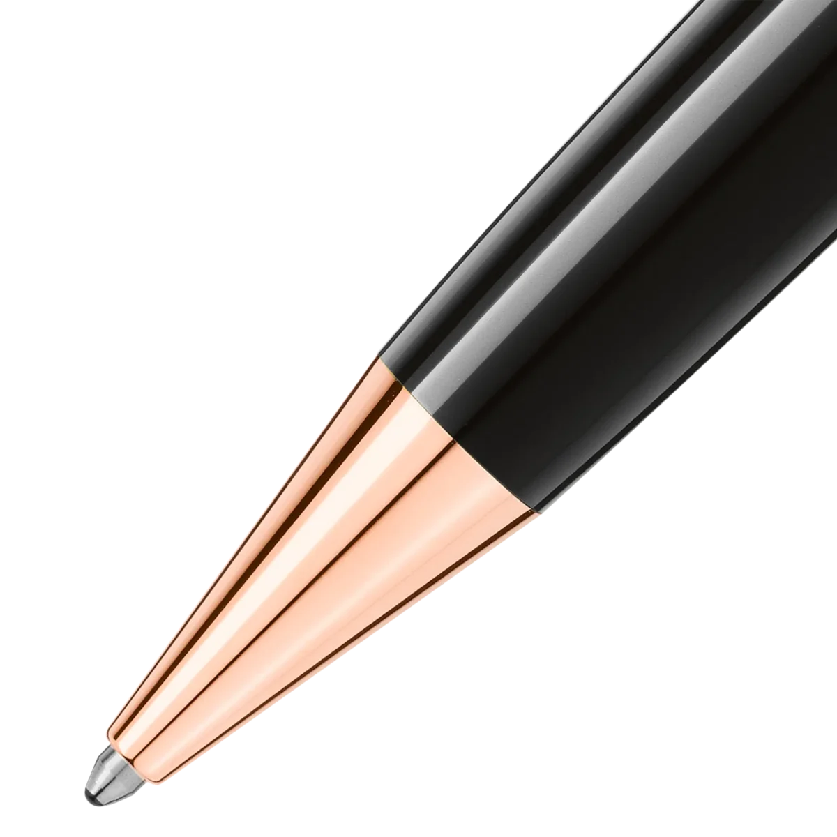 La collection Montblanc Meisterstück LeGrand plaquée or rose est un design qui écrit l’histoire. Lancée en 1924, le mot « Meisterstück » signifie « chef-d’œuvre » et est devenu le symbole de l’écriture de luxe de haute qualité. Le capuchon et le corps sont fabriqués en résine précieuse noire et arborent l’emblématique logo Montblanc blanc incrusté dans le capuchon.