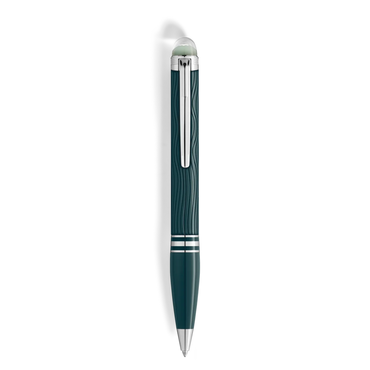 StarWalker PolarGreen donne vie à la beauté des aurores boréales. Sur Terre, les humains peuvent lever les yeux vers le ciel et être transportés dans un monde merveilleux en admirant ce spectacle grandiose. Le dôme sur le capuchon est en résine transparente et brille dans la pénombre, rappelant les aurores boréales qui dansent dans le ciel nocturne. Le motif ondulé de la résine précieuse vert foncé du capuchon et du corps capture admirablement l’éclat spectral des lumières, et la finition mate accentue les reflets harmonieux. Les anneaux en résine vert foncé de la partie avant mettent en valeur les attributs plaqués platine du stylo bille. Numéro d’identification : MB132904 Poids physique : 31,6 g Dimensions : 134,5 mm * 13,1 mm