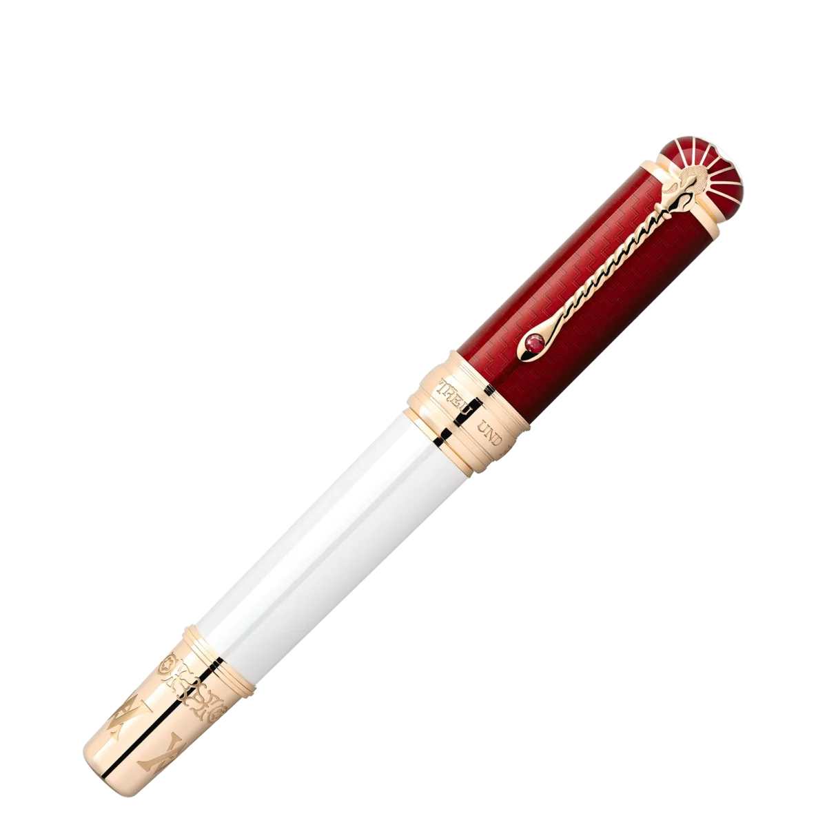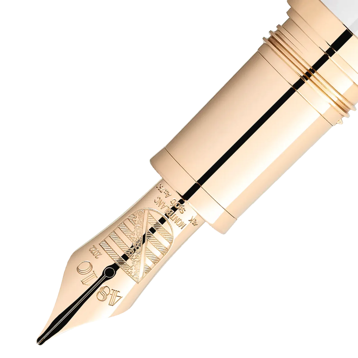 L’édition Montblanc Patron of Art 2022 est dédiée à la reine Victoria et au prince Albert. L’édition limitée 4810 est une édition remarquable dédiée à un couple, l’une rendant hommage à la reine Victoria et l’autre à son époux, le prince Albert. Le stylo plume Montblanc Patron of Art Hommage à Albert Édition limitée 4810 célèbre le jeune Albert et se présente avec un corps laqué blanc nacré ainsi qu’un capuchon laqué bordeaux translucide avec un motif spécial en dessous. Les accessoires sont recouverts d’or. La forme du clip rend hommage au sceptre de son épouse et est ornée d’une pierre synthétique rouge. Le capuchon s’inspire du dôme du palais de cristal et est orné de l’emblème Montblanc en résine précieuse blanche. Alors que la bague du capuchon est gravée de la citation « treu und fest », une gravure spéciale orne le cône. En hommage à ses armoiries personnelles, la plume en or massif 750 fabriquée à la main est ornée d’un motif en relief inspiré des armoiries de la Saxe. Avec la signature en or et/ou le revêtement en or signature, Montblanc décrit la teinte lumineuse de l’or jaune qui est devenue une nuance très appréciée pour les instruments d’écriture de la Maison.