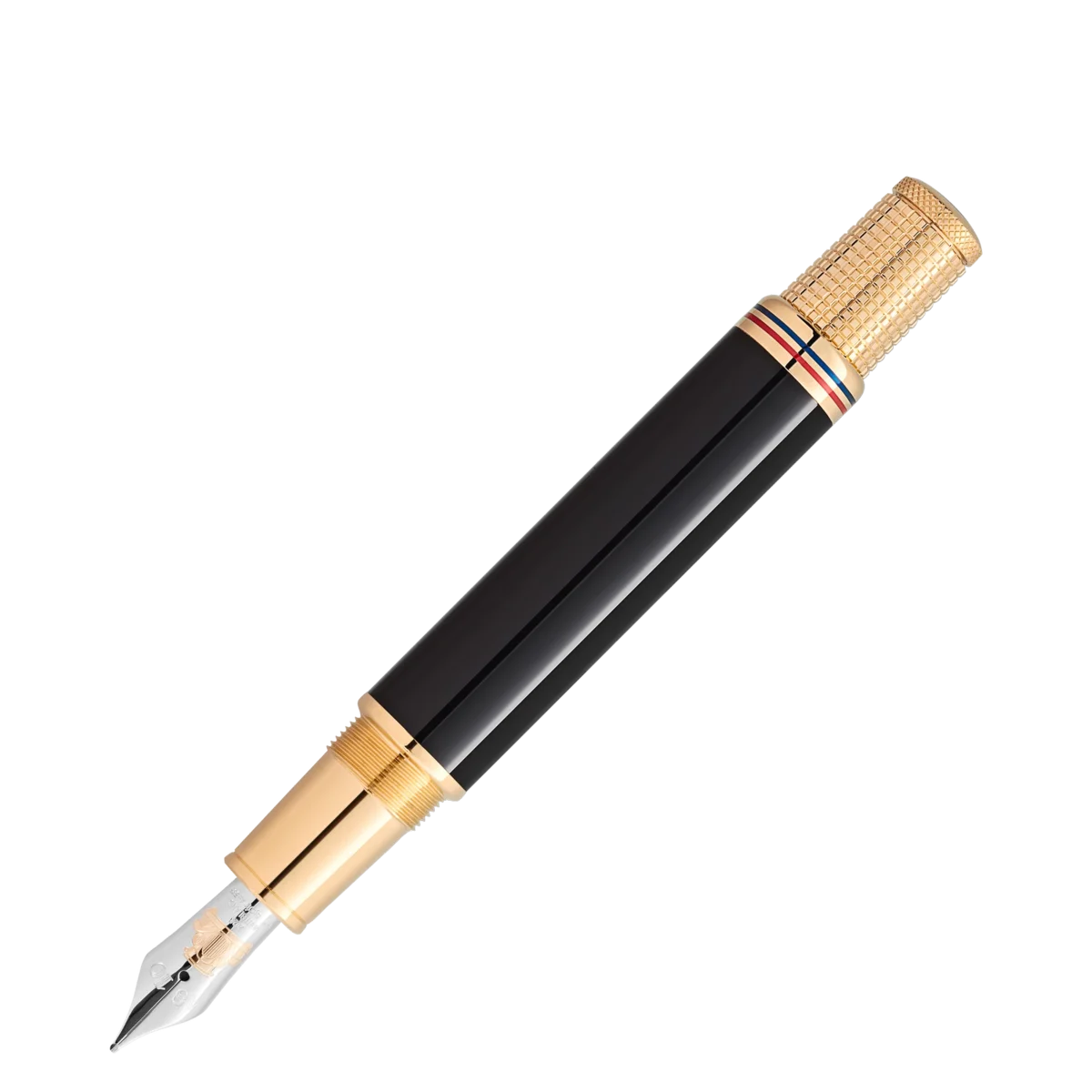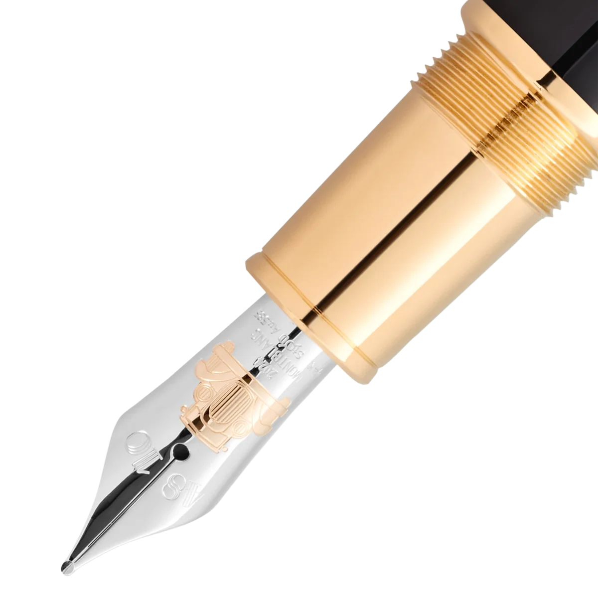Certains romans entrent dans l’histoire littéraire et symbolisent toute une époque. « Gatsby le Magnifique » de F. Scott Fitzgerald est l’un de ces joyaux de la littérature américaine moderne. Publié en 1925, le roman brosse un tableau fascinant de l’ère du jazz et des années folles, une période d’opulence et d’excès sans précédent. La ville palpitante de New York, les somptueuses demeures de Long Island et les fastueuses soirées mondaines servent de toile de fond à l’histoire de Jay Gatsby, un mystérieux millionnaire prêt à tout pour reconquérir l’amour perdu de sa jeunesse, Daisy Buchanan. Le style choisi par l’élite de l’époque est devenu un classique de la mode pour les hommes d’affaires prospères – et l’inspiration derrière cet instrument d’écriture. Le motif à fines rayures du capuchon en laque noire et blanche précieuse s’harmonise avec le corps fini en laque noire précieuse. Le pouvoir apparent de l’argent est symbolisé dans cette édition par l’agrafe recouverte de platine qui prend la forme d’un porte-billets. Son ouverture arrondie resplendit des initiales de Jay Gatsby sous la forme d’un monogramme Art déco doré en forme de losange. Le mythe du rêve américain et le design des flasques souvent élégantes de la période Art déco sont évoqués par le cône qui imite le bouchon à vis gravé d’une flasque et les anneaux fins aux couleurs du drapeau américain qui l’entourent. L’emblème Montblanc qui couronne le stylo est en nacre, un matériau dont les couleurs irisées et l’éclat chatoyant ont inspiré certaines des créations les plus élégantes des joailliers de la période Art déco. L’essence même du rêve américain réalisé se révèle lorsque l’on retire le capuchon et que l’on aperçoit la plume bicolore en or massif 750 rhodié, fabriquée à la main. Elle est décorée d’une image de la somptueuse voiture de Jay Gatsby, décrite avec enthousiasme par F. Scott Fitzgerald comme étant « d’une riche couleur crème, brillante de nickel, … et dotée d’un labyrinthe de pare-brise qui reflétaient une douzaine de soleils ».