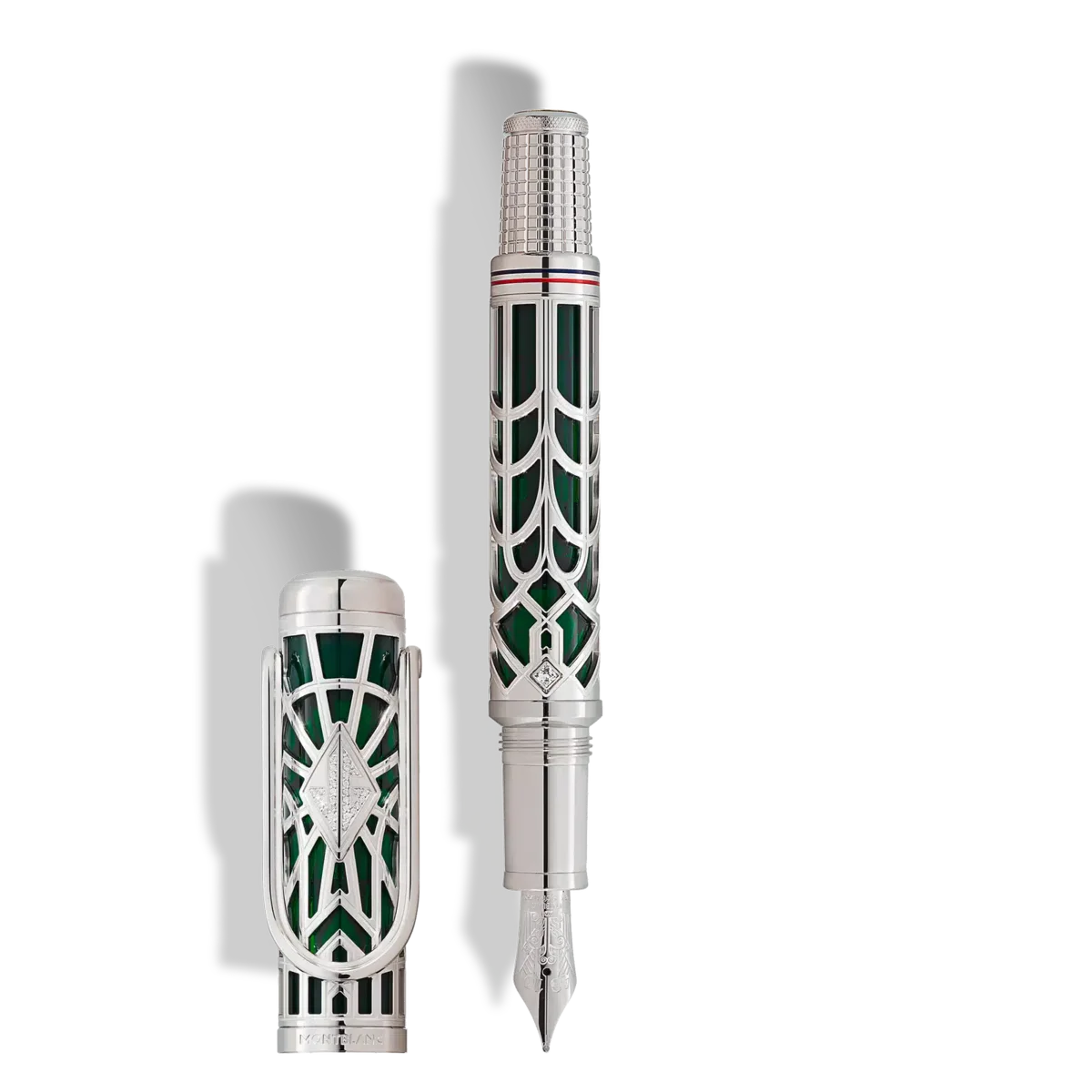 Certains romans entrent dans l’histoire littéraire et symbolisent toute une époque. « Gatsby le Magnifique » de F. Scott Fitzgerald est l’un de ces joyaux de la littérature américaine moderne. Publié en 1925, le roman brosse un tableau fascinant de l’ère du jazz et des années folles, une période d’opulence et d’excès sans précédent. La ville trépidante de New York, les somptueuses demeures de Long Island et les fastueuses soirées mondaines servent de toile de fond à l’histoire de Jay Gatsby, un mystérieux millionnaire prêt à tout pour reconquérir l’amour perdu de sa jeunesse, Daisy Buchanan. Montblanc rend hommage à ce chef-d’œuvre littéraire maintes fois adapté au cinéma, synonyme du monde glamour de l’Art déco, avec la Great Characters Homage to The Great Gatsby Limited Edition 30. La décadence des années folles ainsi que le désir de luxe et d’opulence qui caractérisaient l’époque Art déco sont capturés dans de nombreux détails du design de la Limited Edition 30. Des arcs et des lignes symétriques squelettés sont réalisés en platine massif Pt 950, symbole ultime de richesse et de statut social, souvent utilisé par les joailliers célèbres de l’époque pour leurs créations haut de gamme. Ils révèlent la surface vert foncé et translucide qui se trouve en dessous, représentant la lumière verte sur le quai de la maison de Daisy, symbole du désir d’un avenir meilleur et de l’envie de Gatsby de reconquérir Daisy. Ce symbolisme est également représenté par des tsavorites vertes habilement serties à la main en forme d’emblème Montblanc dans le capuchon en platine massif. Le pouvoir enivrant mais apparemment illusoire de l’argent est symbolisé par le clip recouvert de platine en forme de pince à billets. Son ouverture arrondie est décorée des initiales de Jay Gatsby en platine massif Pt 950, serties de diamants, sous la forme d’un monogramme Art déco rhombique. Des diamants taille princesse sur le capuchon et le corps complètent le design. La gravure purement linéaire sur la plume en or massif 750 rhodié et fabriquée à la main est un autre clin d’œil au mouvement Art déco. Inspirée des flasques Art déco alors en vogue, la gravure artistique sur le cône imite le bouchon à vis gravé de ces flasques. Le mythe du rêve américain est évoqué par les fines anneaux aux couleurs du drapeau américain qui ornent le cône. Un détail d’un dollar de la paix américain original frappé entre 1921 et 1935, reflétant la période du roman, est artistiquement incorporé dans le cône.Le chiffre 30 est significatif à plus d’un titre. Il fait référence au nombre limité de Great Characters Homage to The Great Gatsby Limited Edition 30, qui marque le 30e anniversaire de Nick Carraway, notre fidèle guide dans le monde opulent d’East et West Egg. Au milieu de la tension d’une confrontation décisive entre Gatsby et son ennemi juré Tom Buchanan, Nick se rend compte que c’est son anniversaire : « Non… Je viens de me souvenir que c’est mon anniversaire. J’avais trente ans. La route sinistre et menaçante d’une nouvelle décennie s’étendait devant moi. Le chiffre 30 fait également référence à Tom Buchanan. Le mari énigmatique de Daisy et rival de Gatsby a le même âge que notre narrateur. Nick dresse le portrait du personnage complexe de Tom en le décrivant ainsi : « Il avait changé depuis ses années à New Haven. C’était désormais un homme trapu de trente ans, aux cheveux blonds, avec une bouche plutôt dure et un comportement hautain.