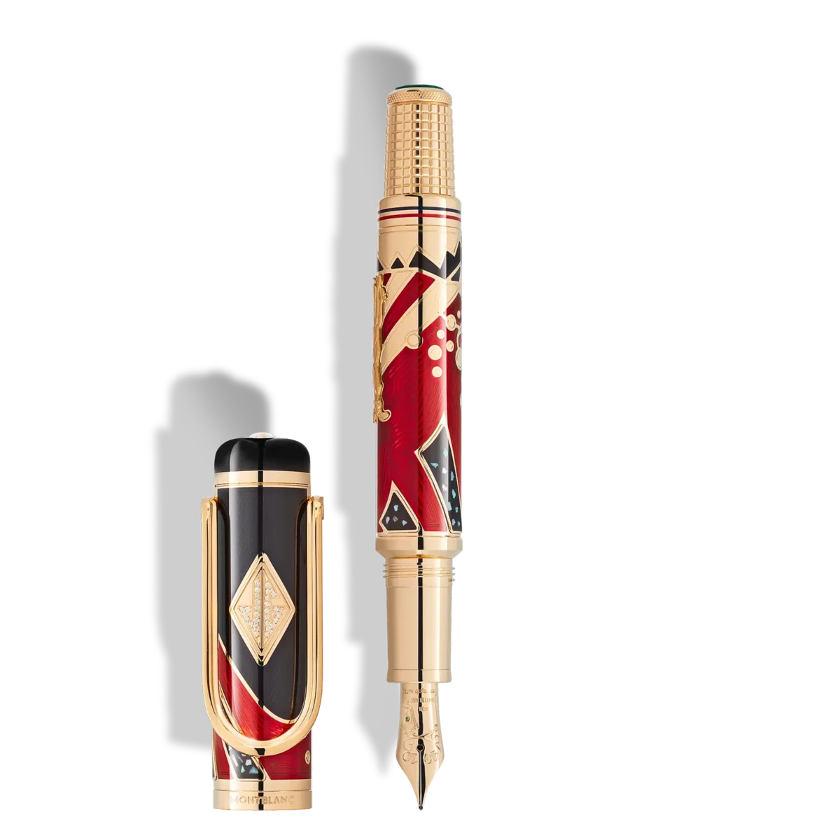 Certains romans entrent dans l’histoire littéraire et, en même temps, en viennent à symboliser toute une époque. « Gatsby le Magnifique » de F. Scott Fitzgerald est l’un de ces joyaux de la littérature américaine moderne. Publié en 1925, le roman brosse un tableau fascinant de l’ère du jazz et des années folles, une période d’opulence et d’excès sans précédent. La ville trépidante de New York, les somptueuses demeures de Long Island et les fastueuses soirées mondaines servent de toile de fond à l’histoire de Jay Gatsby, un mystérieux millionnaire prêt à tout pour reconquérir l’amour perdu de sa jeunesse, Daisy Buchanan. Montblanc rend hommage à ce chef-d’œuvre littéraire maintes fois adapté au cinéma et aux fêtes flamboyantes des années 1920 avec l’édition limitée Great Characters Homage to The Great Gatsby 8. Extraordinaire, élégant, chic : tel était le credo Art déco qui régissait le melting-pot scintillant de créativité artistique, de convivialité et de plaisir hédoniste qu’était New York. Né de l’abondance matérielle des années folles, le capuchon et le corps en or jaune massif 750 contrastent avec leur revêtement laqué rouge vif et noir profond, parsemé de touches de nacre. La combinaison excentrique de formes claires, de matériaux précieux et de techniques de laquage élaborées reflète la sophistication de l’époque et l’influence de l’artisanat japonais séculaire, dont l’aspect exotique et luxueux était très populaire dans les années 1920. Immergé dans ce design effervescent, un couple élégamment vêtu danse le long du bord du corps du stylo. Les deux personnages incarnent un monde de cocktails scintillants, mais ensemble, ils semblent quelque peu détachés de celui-ci. Créée en hommage à l’un des premiers instruments d’écriture Montblanc de l’époque Art déco, l’édition limitée Great Characters Homage to The Great Gatsby 8 raconte l’histoire de l’existence fastueuse de Gatsby à cette époque révolue. Des couleurs éblouissantes, du champagne pétillant et un couple qui danse. Gatsby avec sa bien-aimée Daisy – ici, au moins, pour toujours à ses côtés. Jay Gatsby incarne un idéal universel, celui de l’homme qui s’est fait tout seul à l’américaine. Pourtant, derrière la façade opulente de Gatsby, le rêve commence à s’effriter. Sa richesse provient du commerce illégal d’alcool pendant la prohibition, lorsque le liquide interdit était souvent conditionné dans de petites bouteilles à bouchon à vis, faciles à dissimuler. Chaque goutte était précieuse. En conséquence, non seulement le contenu, mais aussi le design de ces flasques étaient vénérés. Inspirée par cela, la gravure sur le cône de l’instrument d’écriture imite le bouchon à vis gravé d’une flasque Art déco. Le mythe du rêve américain est évoqué par les fines anneaux aux couleurs du drapeau américain qui ornent le cône. Tout comme le capuchon et le corps, les accessoires du Great Characters Homage to The Great Gatsby Limited Edition 8 sont en or jaune massif 750, car l’or est le symbole de la richesse, du pouvoir et du statut social, et la couleur la plus fréquemment mentionnée dans le roman. En revanche, la laque rouge et noir profond représente la corruption et la décadence morale qui se cachent derrière la façade scintillante de la société aisée. Le pouvoir enivrant mais apparemment illusoire de l’argent est symbolisé par le clip recouvert d’or jaune en forme de pince à billets. Son ouverture arrondie resplendit des initiales de Jay Gatsby sous la forme d’un monogramme Art déco rhombique, un éclatant pavé de diamants. L’emblème Montblanc qui couronne le stylo est composé d’un diamant entouré d’un contour en or massif 750 et de jade noir, une combinaison de matériaux qui a inspiré certaines des créations les plus élégantes des joailliers de la période Art déco. Le message au cœur du roman semble se cristalliser en un seul point : le faisceau de lumière verte scintillant sur le quai de la maison de Daisy. Cette même lumière verte brille au cœur de l’instrument d’écriture, la plume en or massif 750 fabriquée à la main : une tsavorite illuminant une lanterne finement gravée. Associée au cabochon vert dans le cône, elle symbolise l’aspiration à un avenir meilleur et le désir de Jay Gatsby de reconquérir Daisy. Le huitième jour marque le début d’une nouvelle semaine, d’une nouvelle ère. Jay Gatsby aurait apprécié l’interprétation chinoise du chiffre huit comme chiffre porte-bonheur, car il ressemble au mot qui signifie fortune et prospérité. Numéro d’identification MB132025 Poids physique 111,2 g Dimensions 145 mm * 22 mm * 22 mm