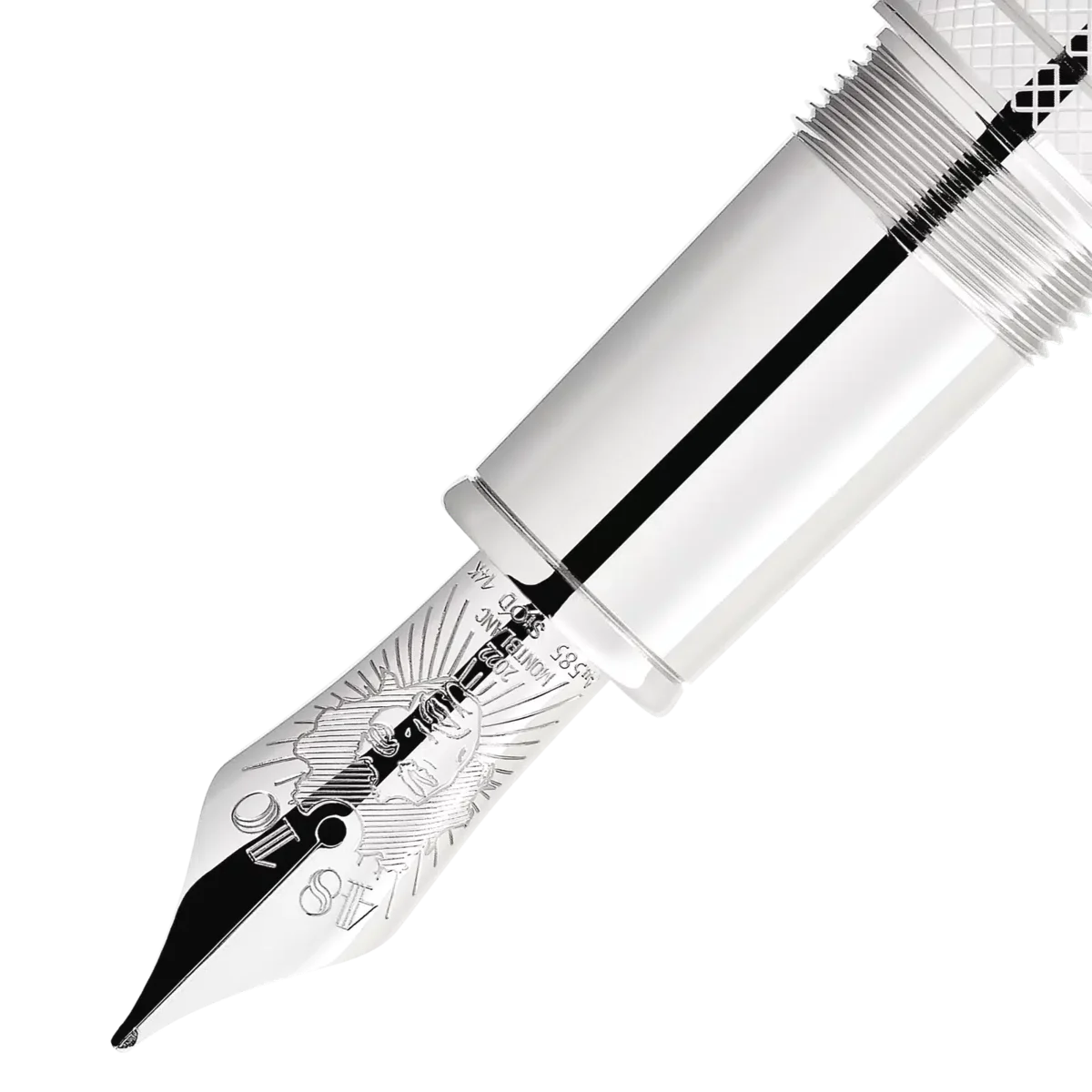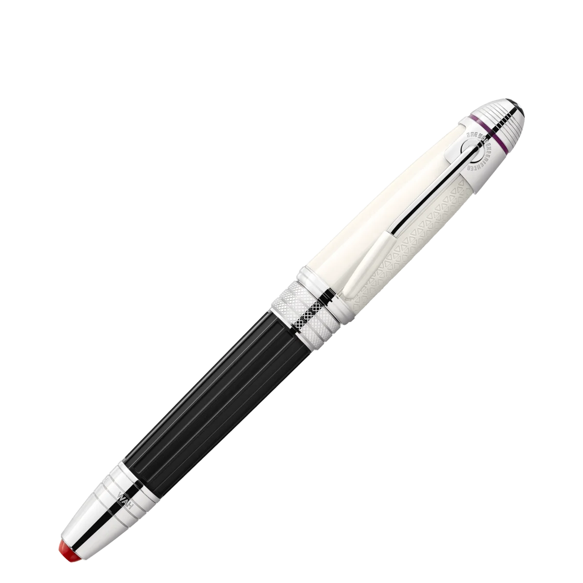 En 2022, Montblanc rend hommage à l’un des musiciens les plus célèbres du XXe siècle, largement considéré comme l’un des guitaristes électriques les plus influents de l’histoire de la musique populaire : Jimi Hendrix. Fabriqué en résine précieuse, le capuchon de couleur blanc cassé et son motif gravé s’inspirent d’une des sangles de guitare portées par Hendrix, tandis que le corps noir présente un motif élégant ressemblant à une pédale WAH. Le clip plaqué platine est incliné pour ressembler à la barre de vibrato d’une guitare électrique. L’emblème Montblanc sur le dessus du capuchon est en résine précieuse. Un autre détail frappant est la bague du corps plaquée platine qui s’inspire d’un câble de guitare des années 1960 – elle est gravée de la date d’un célèbre concert de Jimi Hendrix. La plume en or massif Au 585 plaquée rhodium et fabriquée à la main porte un portrait de Jimi Hendrix. Numéro d’identification : MB128842 Poids physique : 60,55 g Dimensions : 147,8 mm * 16,9 mm