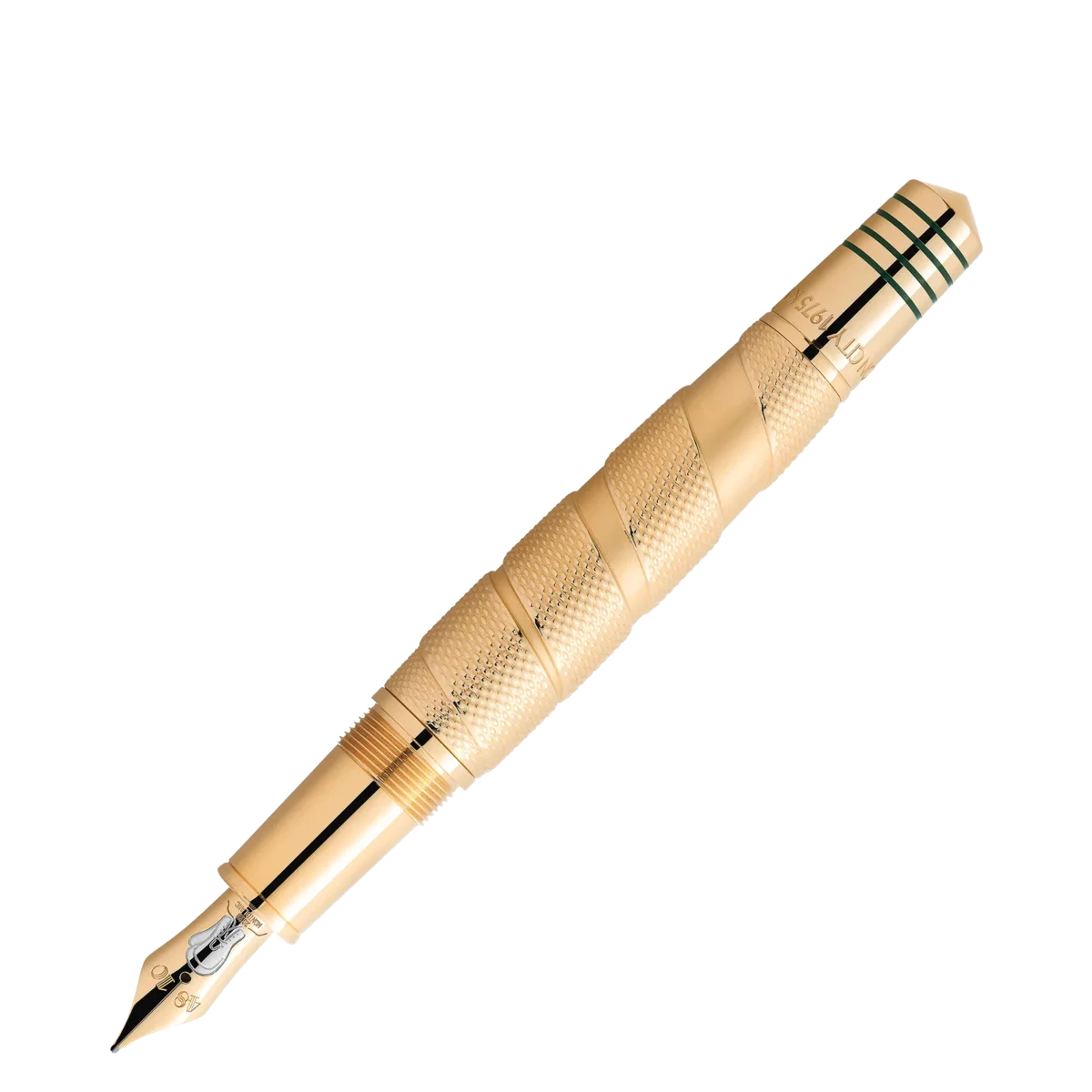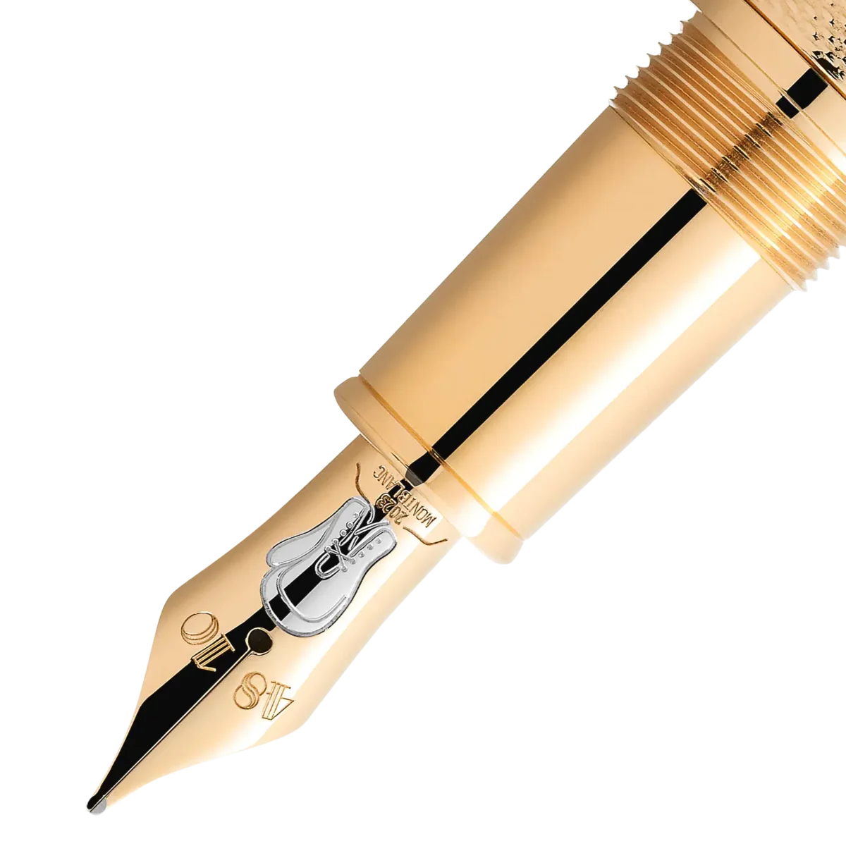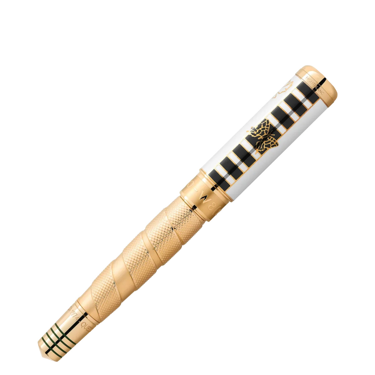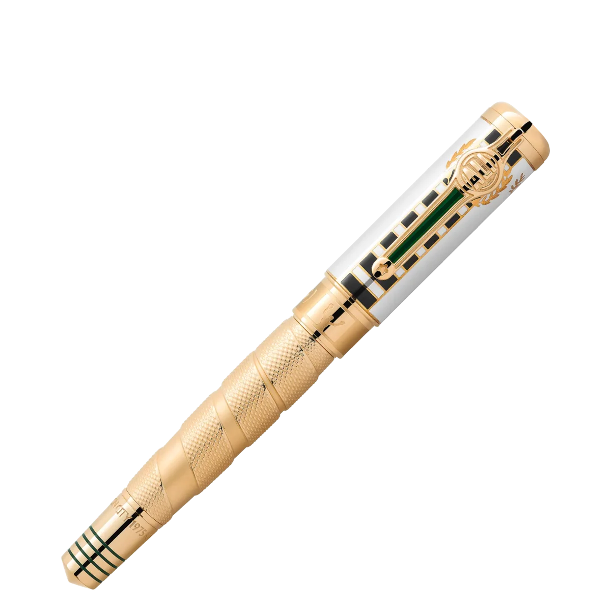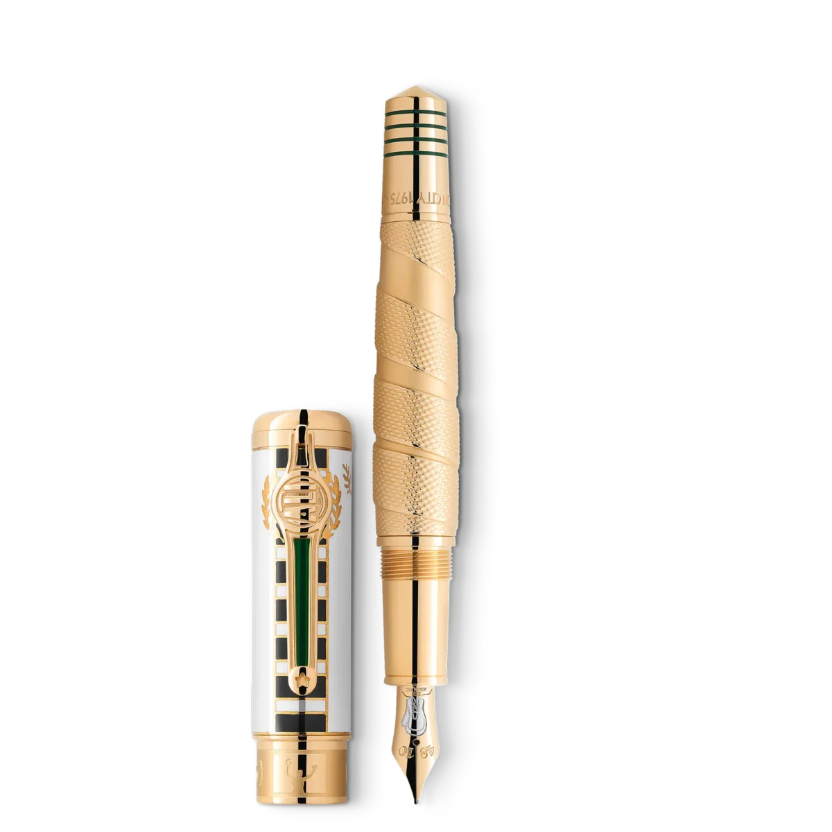 Peu d’athlètes sont aussi célèbres et honorés que Muhammad Ali, triple champion du monde des poids lourds, dont les exploits légendaires dans le domaine du sport et de la lutte pour les droits civiques ont fait de lui l’un des athlètes et humanitaires les plus influents du XXe siècle. En tant qu’athlète, Ali a bouleversé le monde par sa force, son talent et sa personnalité, devenant champion du monde des poids lourds à seulement 22 ans. Cependant, ses plus grands succès sont le fruit de ses efforts humanitaires. Inspiré par la robe qu’Ali portait lors du combat légendaire à Kinshasa, au Zaïre, en 1974, le précieux vernis sur le capuchon représente ce motif distinctif, tandis que le motif sur le corps recouvert d’or ressemble aux bandes de boxe que les athlètes utilisent pour envelopper leurs mains. Le papillon recouvert d’or sur la casquette s’inspire de son style de combat caractéristique : « Flotte comme un papillon, pique comme une abeille ». Le cône pointu reprend cette idée et les quatre lignes laquées rappellent les cordes d’un ring de boxe. Les inscriptions sur le cône font référence à la victoire d’Ali lors du combat de 1974 surnommé « Rumble in the Jungle », où il remporta son deuxième titre de champion du monde des poids lourds. Les détails de sa victoire, à savoir qu’il a gagné au huitième round par KO technique, figurent sur la bague du capuchon. Le cône fait également référence à un célèbre combat d’Ali en 1975, surnommé « Thrilla in Manila ».Pour célébrer son deuxième titre, l’emblème Montblanc en résine précieuse blanche est orné d’un « 2 ». Pour souligner ce succès, l’agrafe a la forme d’une ceinture de championnat de boxe et porte son nom. La plume bicolore en or massif 750 fabriquée à la main représente un gant de boxe. Numéro d’identification : MB129336 Poids physique : 95,76 g Dimensions : 147,3 mm * 17,3 mm