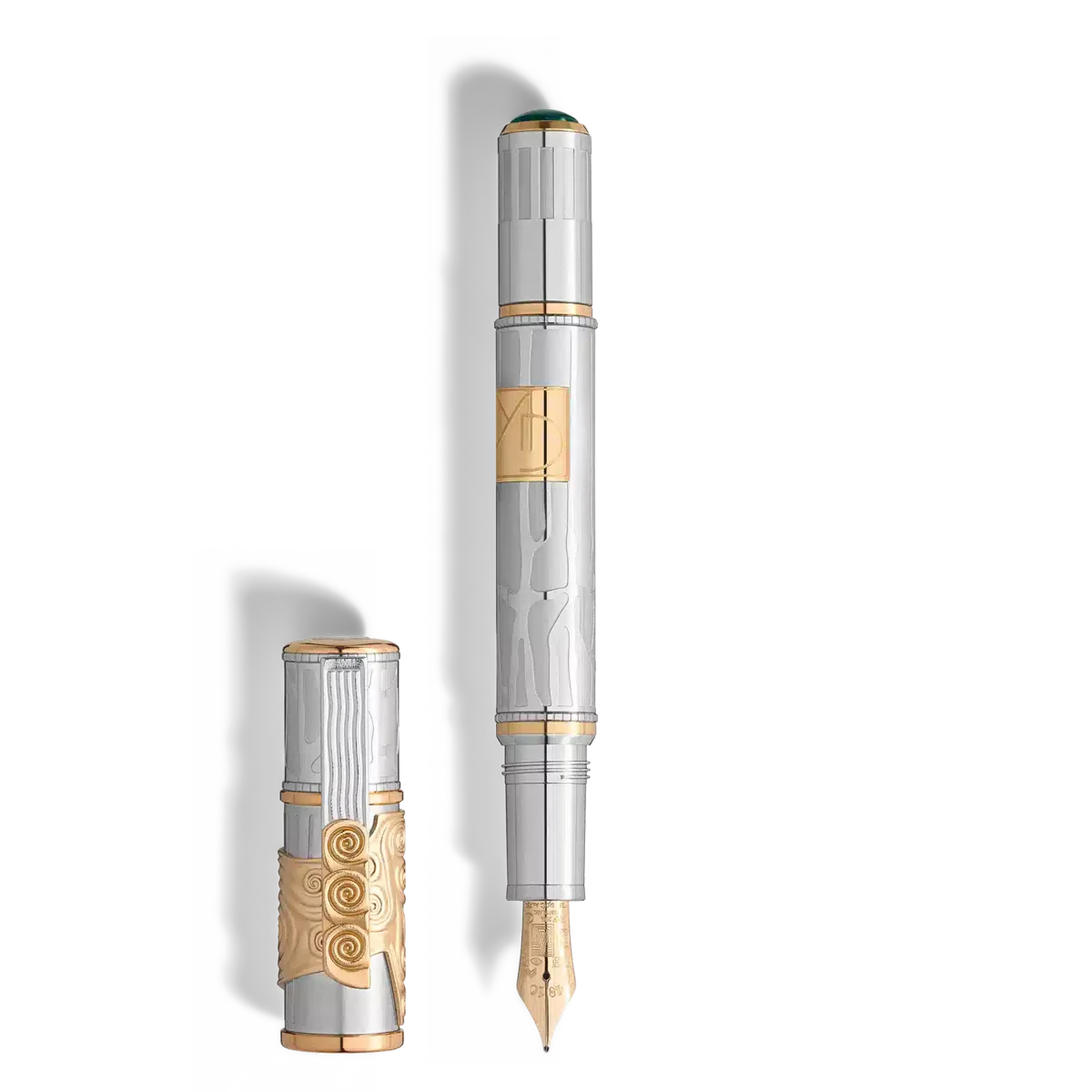 Tout au long de l’histoire, de grands artistes ont exprimé l’expérience humaine dans un langage universel fait de formes et de beauté. La collection Montblanc Masters of Art rend hommage à leur contribution éternelle à la quête de la perfection dans l’art, une quête que Montblanc célèbre et à laquelle elle participe. Gustav Klimt est l’un des artistes dont la vision a contribué à façonner l’Art nouveau viennois et l’âge d’or. Le stylo plume Montblanc Masters of Art Hommage à Gustav Klimt Édition limitée 888 célèbre son engagement actif dans la Sécession viennoise et reprend les éléments marquants de sa frise Beethoven, chef-d’œuvre à grande échelle de sa « période dorée » qu’il a créé pour le bâtiment de la Sécession. Le revêtement en or jaune massif 750 en relief sur le capuchon recouvert de platine, avec ses spirales et ses lignes verticales symbolisant les cordes d’une lyre, fait référence à l’ornementation dorée de la frise Beethoven ainsi qu’à sa figure poétique jouant de la lyre, dont les sons sont censés apaiser le désir de bonheur de l’humanité. Des lignes bidimensionnelles inspirées des reliefs de la façade du bâtiment de la Sécession brillent sur le fond mat du capuchon et du corps recouverts de platine. La combinaison d’éléments en or jaune massif 750 et recouverts de platine sur le capuchon et le corps fait écho aux matériaux expérimentaux et luxueux typiques de Gustav Klimt. Le jeu des couleurs est enrichi par un cabochon en malachite dans le cône. La couleur verte de la malachite évoque le printemps, saison des nouveaux départs. En hommage aux réalisations de Klimt pour la Sécession viennoise, l’incrustation en or massif Au 750 sur le corps porte son monogramme de la Sécession avec les initiales GK. Le clip de l’édition limitée 888 Hommage à Gustav Klimt est spécialement conçu en référence à la Pallas Athéna de Gustav Klimt. Athéna étant à la fois la déesse de la guerre et des arts, elle est représentée en train de lancer la lutte pour la liberté artistique. Les lignes légèrement incurvées se terminant par trois spirales sur le clip partiellement recouvert de platine et partiellement recouvert d’or jaune de l’édition limitée 888 correspondent à la décoration du cadre métallique forgé. La plume en or jaune massif 750 fabriquée à la main de l’édition limitée 888 Homage to Gustav Klimt est ornée d’éléments graphiques finement gravés qui forment les motifs géométriques typiques que l’on retrouve dans de nombreuses œuvres de Gustav Klimt.