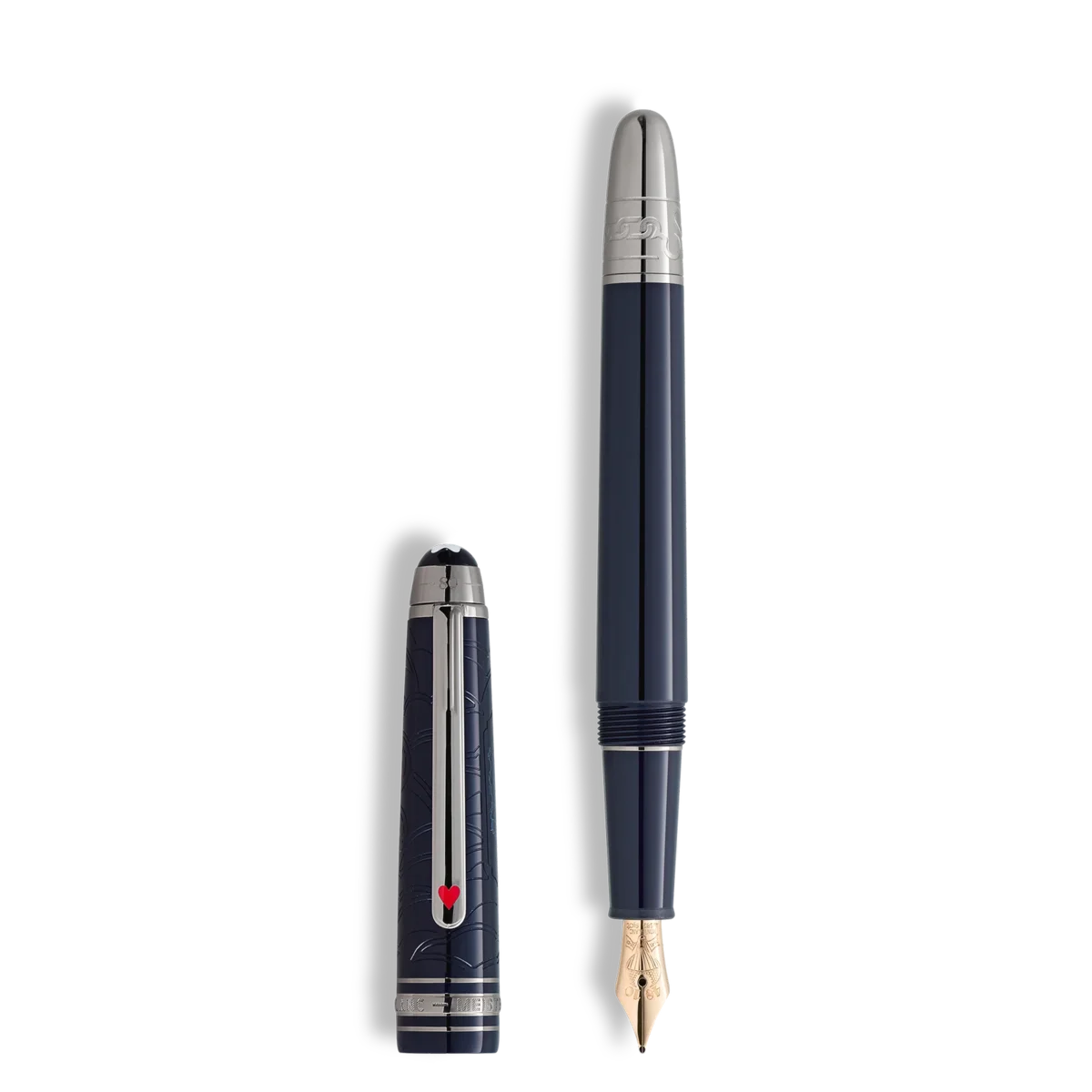 La collection Meisterstück Around the World in 80 Days s’inspire du célèbre roman d’aventures de Jules Verne. Le stylo plume Classique, orné de résine précieuse bleu foncé, retrace le voyage épique de M. Fogg et Passepartout. Embarquant pour la dernière étape de leur périple, de Yokohama à Londres en passant par les États-Unis, le duo traverse le vaste continent américain en train. Plongez-vous dans les détails complexes : un train élégamment gravé au laser sur le capuchon, un motif de chaîne de sécurité sur le cône, reflétant un moment crucial où Passepartout détache le train de la locomotive pour sauver l’équipage attaqué par les Sioux.Le design de la casquette représente les soupapes de pression et la fumée tourbillonnante de la locomotive, tandis que l’attache arbore un cœur rouge laqué, symbolisant l’union entre Phileas Fogg et la princesse Aouda. De plus, les couleurs des cartes représentent le pari audacieux de Fogg de terminer le voyage en seulement 80 jours. Le haut du capuchon porte en relief le calendrier du voyage : 36 jours de Yokohama à Londres, pour un total de 80 jours autour du monde.Cet instrument d’écriture est rehaussé d’une plume en or 14 carats fabriquée à la main et marquée 14/11 et 21/12, en référence au départ de M. Fogg de Yokohama le 14 novembre et à son ambitieux projet de revenir au club de Londres avant le 21 décembre pour remporter son pari. Il est également orné d’une représentation d’une montgolfière, en référence au premier roman d’aventure de Jules Verne. Numéro d’identification MB132878 Poids physique 23,177 g Dimensions 139,2 mm * 16,1 mm
