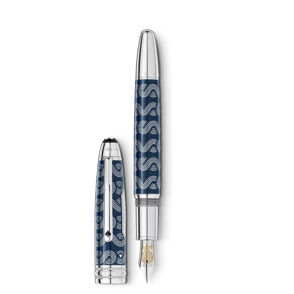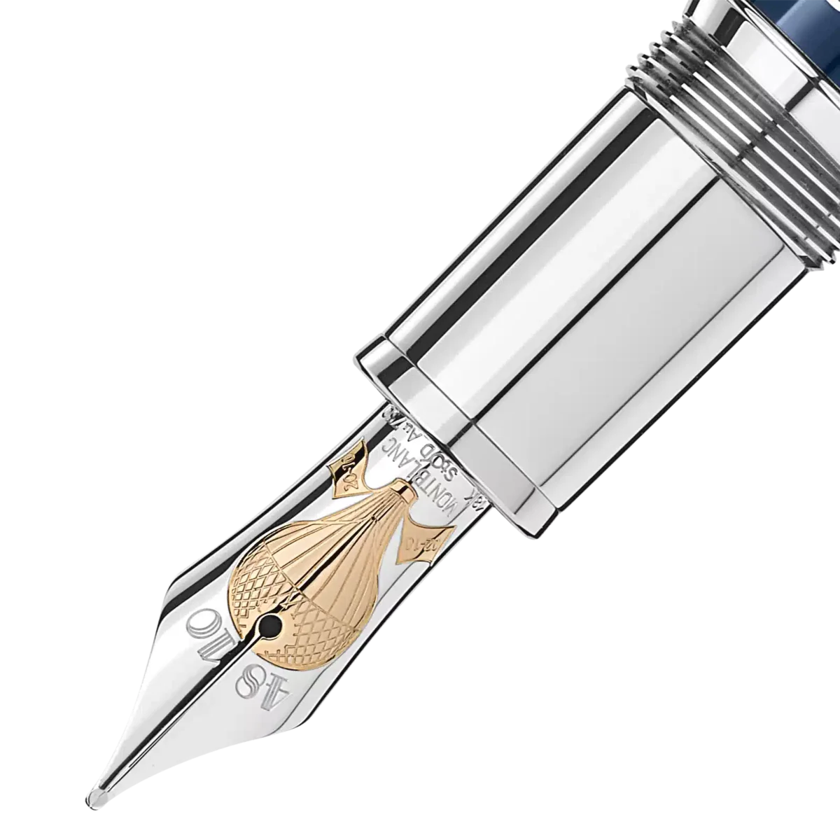 La collection Meisterstück Around the World in 80 Days s’inspire du célèbre roman d’aventures de Jules Verne. Le stylo plume Solitaire Le Grand, en laque bleue translucide avec finition dégradée, s’inspire de la première partie du voyage. Le personnage principal voyage, principalement en bateau à vapeur, de Londres à Bombay, en traversant la Méditerranée et le canal de Suez. Le capuchon et le corps présentent un motif fraisé représentant les éléments clés du roman : les vagues de l’océan, les couleurs des cartes à jouer et un cartouche avec un bateau à vapeur gravé au laser. Le capuchon est estampillé de la durée du voyage, 18 jours de Londres à Bombay et 80 jours au total. L’instrument d’écriture est doté d’une plume bicolore en or 750 rhodié et champagne, plaquée à la main, ornée d’une montgolfière et des dates de début et de fin de ce voyage aventureux.