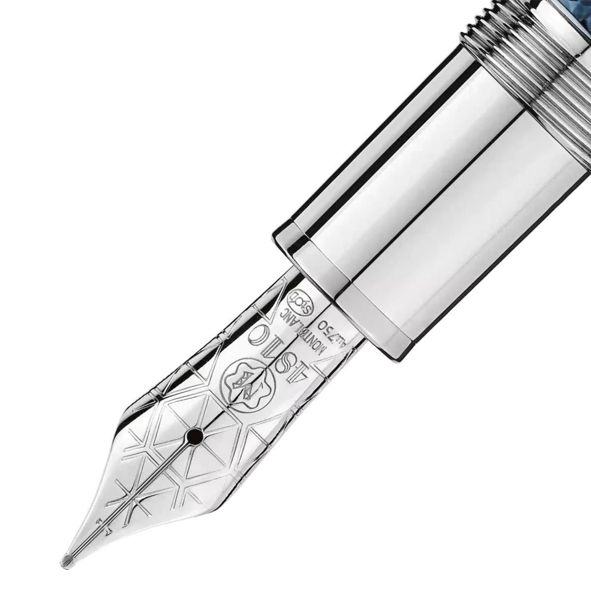 Le Meisterstück Solitaire Blue Hour LeGrand se présente comme un précieux produit Solitaire laqué bleu avec des attributs plaqués platine. L’heure magique entre le jour et la nuit, l’heure bleue, crée un contraste harmonieux et une ambiance à couper le souffle, qui ont inspiré le design. Le motif hexagonal sur la plume en or rhodié fabriquée à la main, ainsi que sur le corps et le capuchon, reflète la réfraction des lumières et la circulation nocturne dans les villes urbaines.