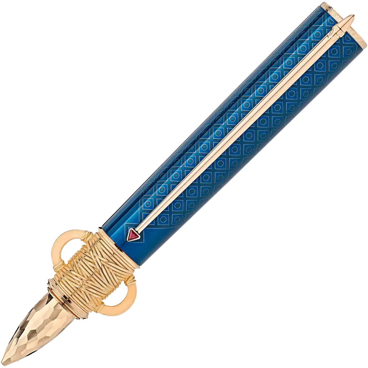 Moctezuma Ier fut couronné souverain du grand empire aztèque en 1440, inaugurant ainsi l’âge d’or des Aztèques. Sous son règne, il façonna l’image de l’État aztèque que nous connaissons aujourd’hui, un État riche en culture et en mythologie. La capitale Tenochtitlán, aujourd’hui Mexico, s’épanouit sous son règne. Le stylo plume Montblanc Patron of Art Hommage à Moctezuma I Édition limitée 4810, avec ses attributs signature plaqués or, est dédié à ce souverain suprême de l’une des cultures les plus particulières de l’histoire mondiale. Le design général s’inspire d’un atlatl, un lance-javelot aztèque. La forme du cône, raffinée avec une finition martelée, s’inspire d’un couteau sacrificiel aztèque à lame d’obsidienne. Les couleurs de la laque, pétrole et rouge carmin, s’inspirent des couleurs du manteau royal. Les deux hiéroglyphes qui ornent le capuchon symbolisent les années du règne de Moctezuma Ier. La plume en or massif Au 750 fabriquée à la main est ornée d’une fine gravure inspirée du glyphe aztèque de la ville de Tenochtitlán : un cactus à trois bras avec un diadème royal et deux volutes.
