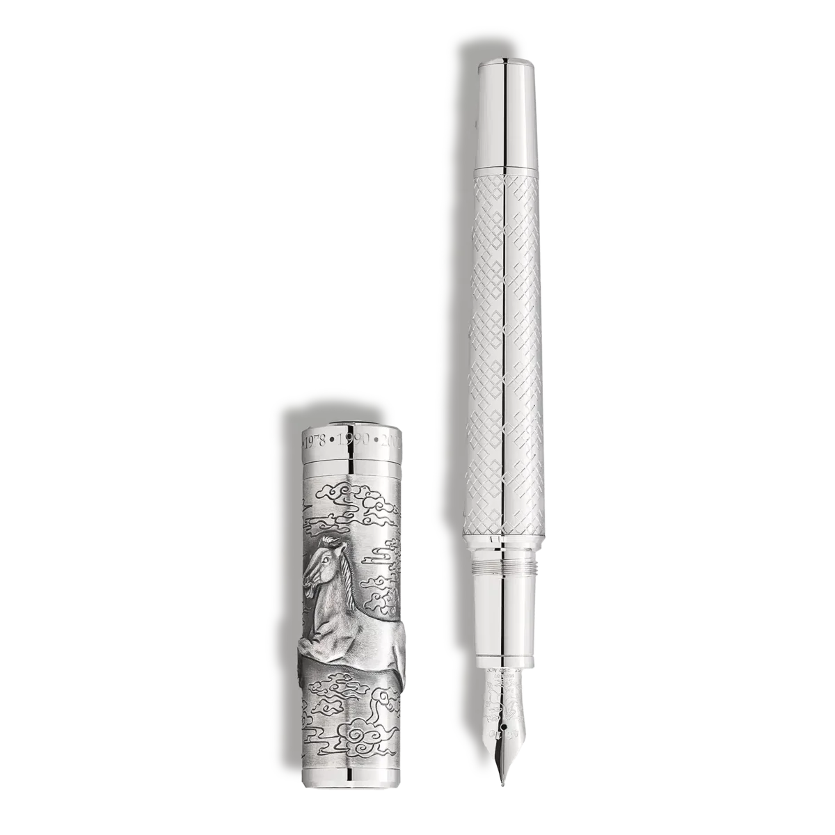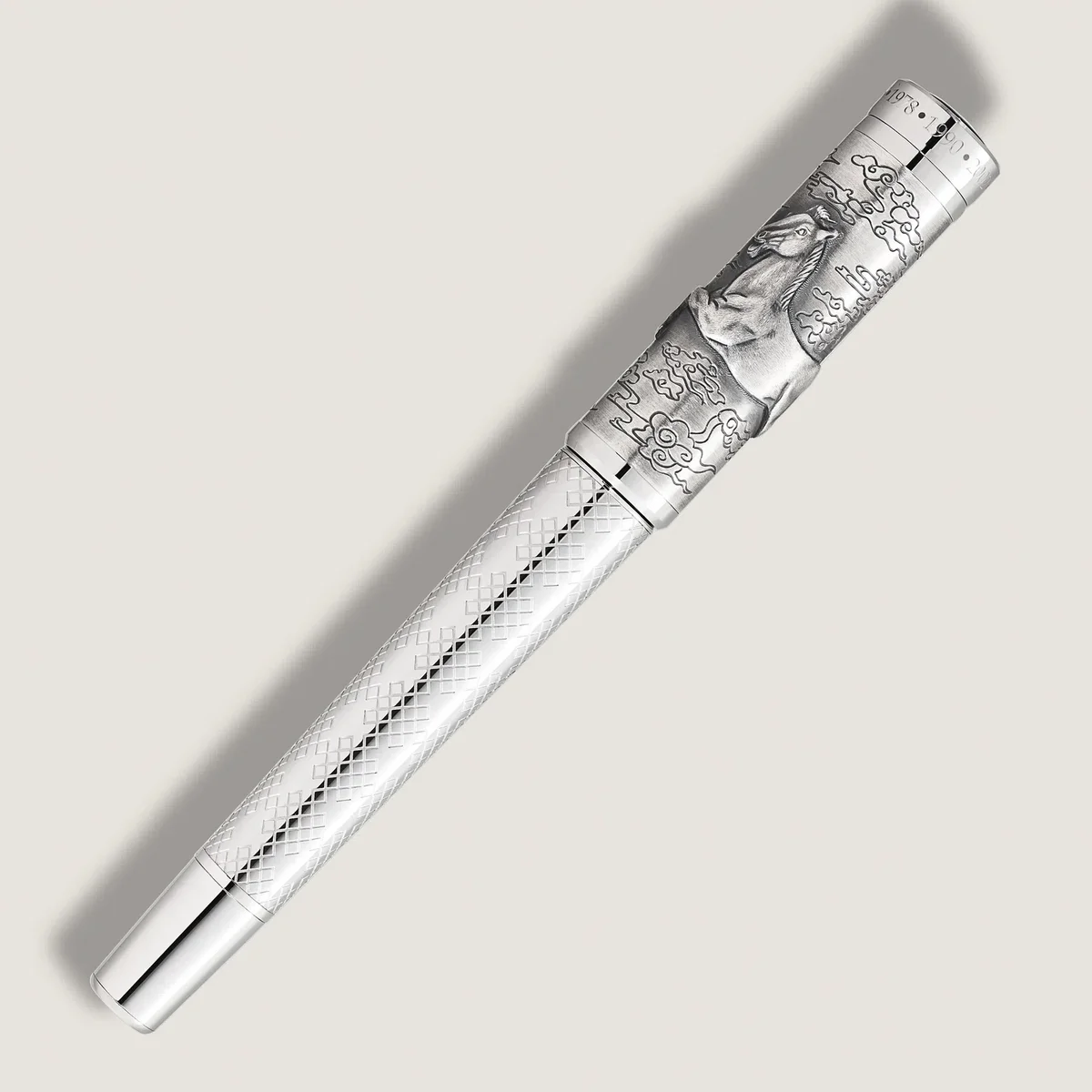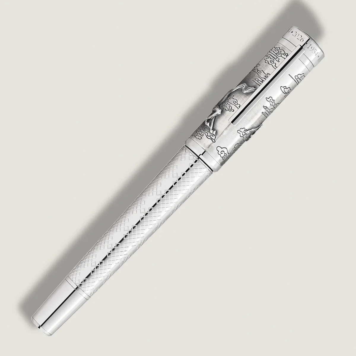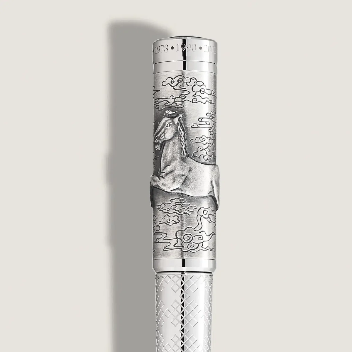 Le stylo plume Montblanc The Legend of Zodiacs The Horse Limited Edition 512 (8x8x8) est dédié au septième signe du zodiaque ainsi qu’au chiffre 8, considéré comme un chiffre porte-bonheur dans les cultures asiatiques.Le capuchon est en argent sterling 925 et est orné d’une reproduction minutieuse d’un cheval gravé à la main, en l’honneur à la fois du signe du zodiaque et des chevaux rapides et longilignes de la Chine ancienne. Légers, bien proportionnés et semblant voler comme le vent, ils étaient appelés « tianma », les chevaux célestes. Les premières références les décrivent comme un symbole de positivité et de promesse. La grâce de l’animal est évoquée sur le capuchon par le mouvement délicat de la tête, son chignon chinois typique et sa démarche fluide. Le cheval est entouré d’ornements délicatement gravés inspirés du « nuage porte-bonheur » (祥云), symbole de chance en Chine. Le corps recouvert de platine est décoré d’une fine gravure ornementale inspirée du nœud chinois porte-bonheur « Zhōngguó jié » (中国结), tandis que le cône est orné d’une topaze en référence à la pierre de naissance du signe du cheval. L’année actuelle du cheval, 2026, est gravée sur la bague du capuchon aux côtés des six années précédentes du cheval, tandis que le capuchon est couronné de l’emblème Montblanc en nacre. Le motif du cheval ailé figure également sur la plume en or massif 750 rhodiée et fabriquée à la main.