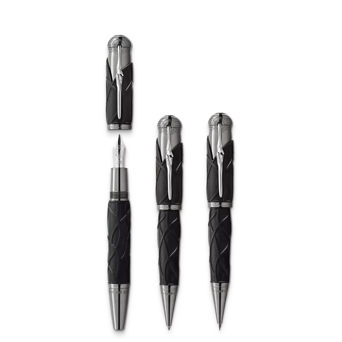 « Il était une fois… » Le stylo Montblanc Writers Edition Homage to the Brothers Grimm est dédié à Jacob et Wilhelm Grimm et rend hommage à leur travail sur les contes populaires allemands et européens, parmi lesquels figurent certains des contes de fées les plus célèbres tels que « Blanche-Neige », « Cendrillon » et « La Belle au bois dormant ». La silhouette générale de l’instrument d’écriture a la forme d’un vieux bâton de randonnée, tandis que sa couleur noire rappelle l’obscurité des bois qui servent généralement de décor principal aux contes populaires des frères Grimm. De plus, le motif ondulé sur le capuchon et le corps s’inspire des cheveux de Raiponce tout en rappelant des racines, car les frères Grimm considéraient leur travail linguistique comme une « recherche sur les racines ». Le capuchon est couronné de l’emblème Montblanc en résine précieuse. Le clip recouvert de platine, qui rappelle un morceau de bois noueux, révèle de manière surprenante la silhouette du profil des frères Grimm lorsqu’on le tourne. Numéro d’identification : MB128368
