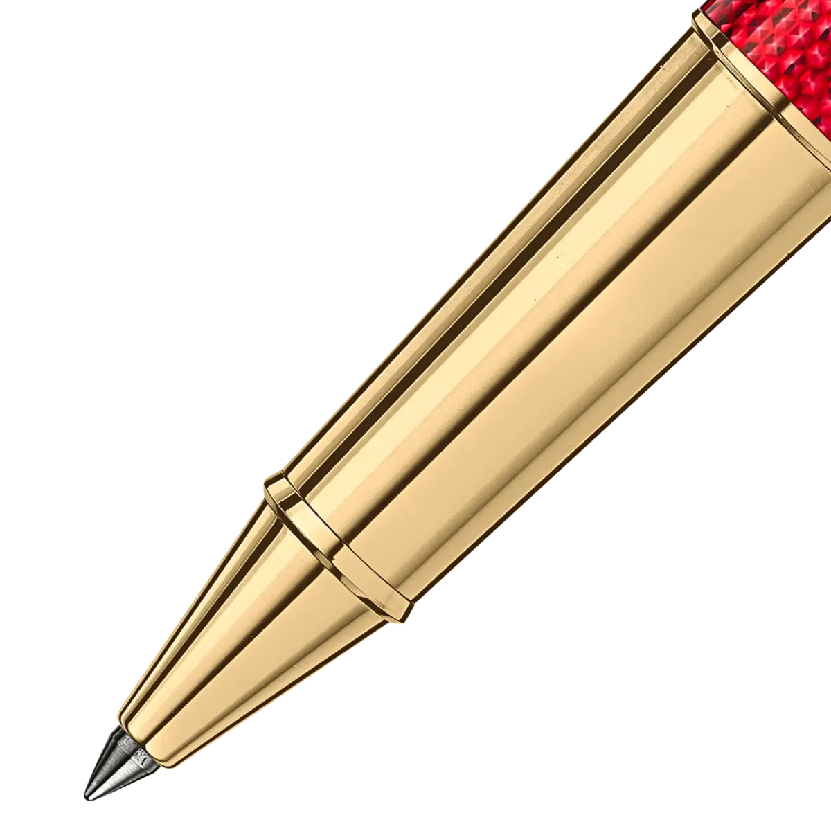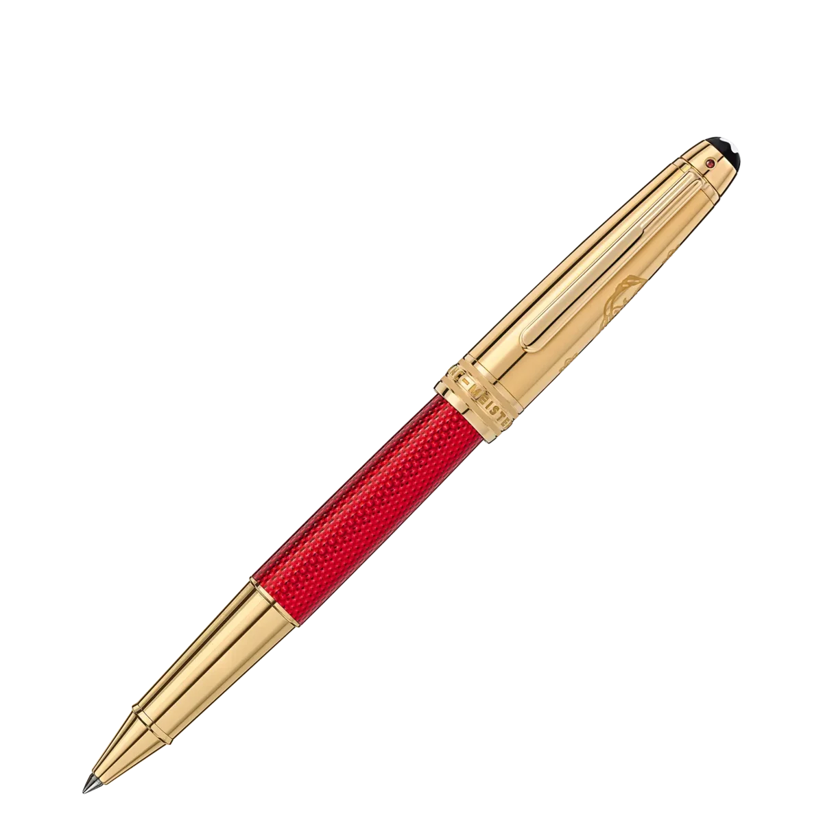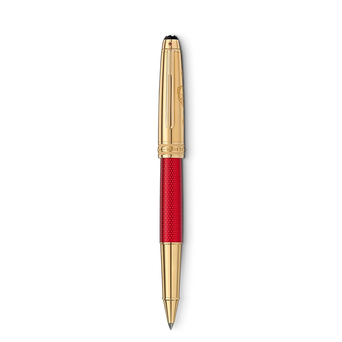 Le Meisterstück Solitaire Doué Red Hour est une édition spéciale rendant hommage à certains des plus anciens symboles chinois. Il se présente sous la forme d’un précieux rollerball laqué rouge avec des attributs plaqués or. La couleur rouge du corps symbolise la chance et le bonheur dans la culture traditionnelle chinoise. Le capuchon est orné d’un motif combinant des nœuds chinois et des carpes koï, qui sont également des symboles de chance. Le capuchon est serti d’un rubis de 1,5 mm.