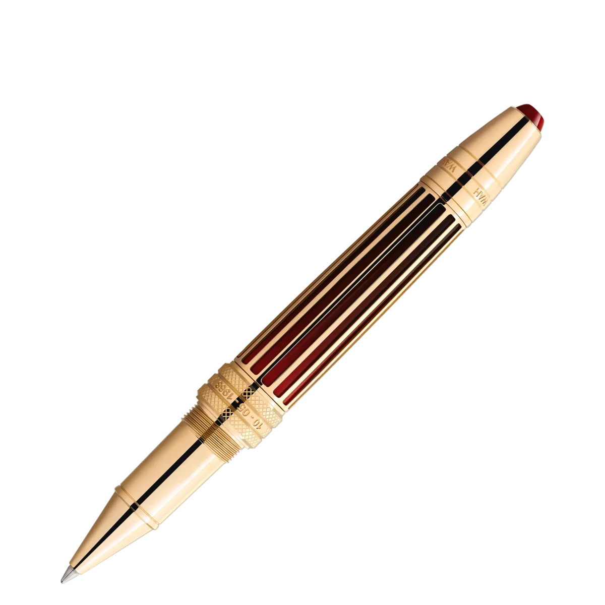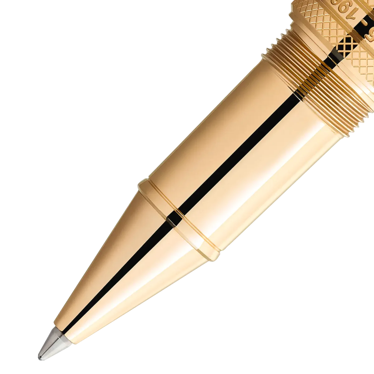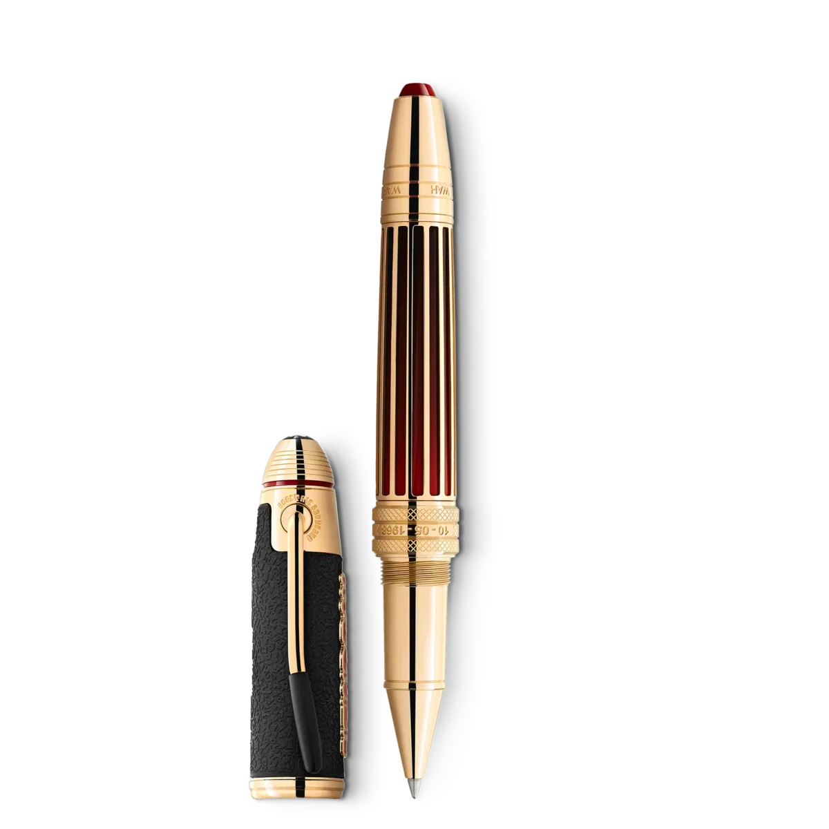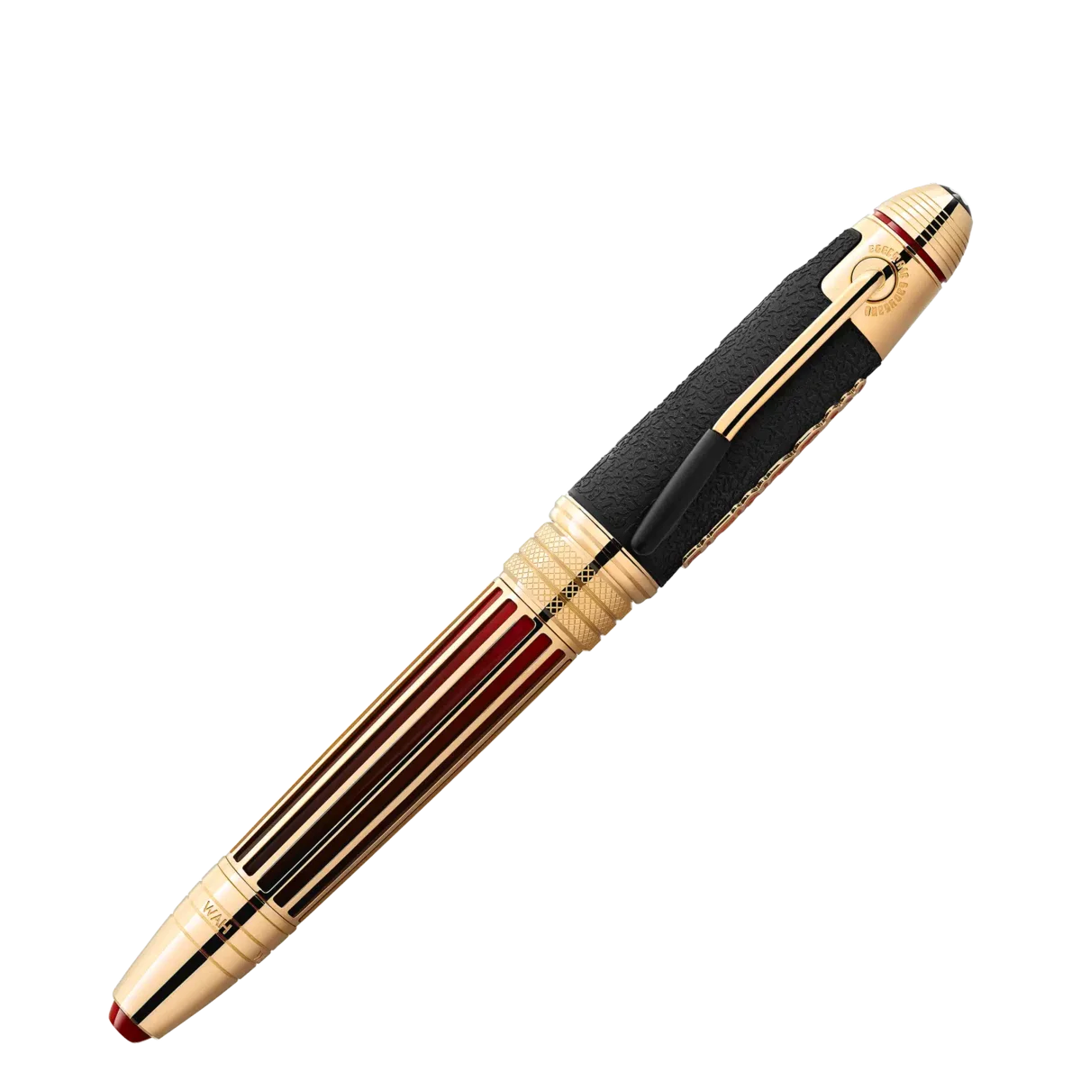 En 2022, Montblanc rend hommage à l’un des musiciens les plus célèbres du XXe siècle, largement considéré comme l’un des guitaristes électriques les plus influents de l’histoire de la musique populaire : Jimi Hendrix.Inspiré de la pochette de l’album « Electric Ladyland » sorti en 1968, le corps de ce stylo à bille Limited Edition 1942 est recouvert d’une laque dégradée maintenue par une superposition squelettée. La surface du capuchon symbolise le matériau d’un amplificateur utilisé par Hendrix et arbore un badge en laque. Le clip plaqué or jaune est incliné pour ressembler à la barre de vibrato d’une guitare électrique. L’emblème Montblanc sur le sommet du capuchon est en résine précieuse. Un autre détail frappant est la bague du corps plaquée or jaune qui s’inspire d’un câble de guitare des années 1960 – elle est gravée de la date d’un célèbre concert de Jimi Hendrix.