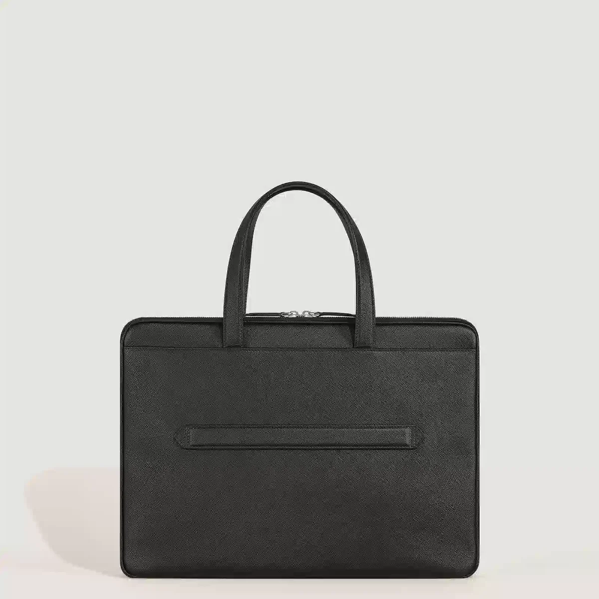 Cette mallette fine en cuir noir gaufré Sartorial est conçue pour les professionnels modernes. Sa finition artisanale raffinée complète les sangles avant emblématiques du modèle, qui ajoutent à la fois sécurité et touche distinctive. L’ouverture à 360° offre un accès facile, tandis que les deux compartiments principaux, une sangle pour ordinateur portable, deux poches ouvertes et deux boucles pour stylos permettent de ranger tous les essentiels professionnels. Équipée d’un système satellite pour la fixation à un trolley, cette mallette est conçue pour ceux qui concilient travail et voyages avec style.