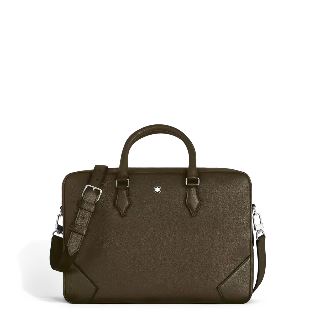 Cet élégant porte-documents, confectionné en cuir grainé luxueux de couleur kaki, célèbre le lien qui unit Montblanc à la culture de l’écriture grâce à ses détails en forme de plume sur les tirettes et les poignées. À l’intérieur, elle offre une organisation bien pensée avec une grande poche ouverte, une poche zippée, deux poches ouvertes supplémentaires et deux boucles pour instruments d’écriture. Une bandoulière amovible en cuir et un système satellite offrent des options de transport polyvalentes, ce qui en fait le compagnon idéal pour les voyages d’affaires.