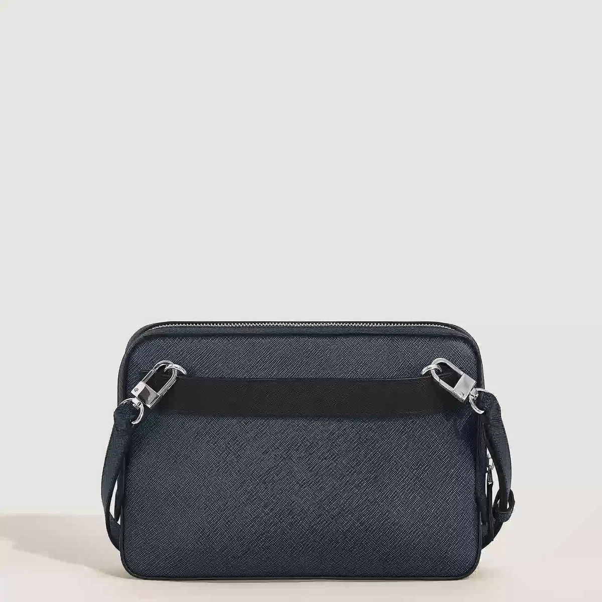 Inspiré par l’univers de l’écriture, ce mini sac à bandoulière est confectionné en cuir Sartorial gaufré dans une combinaison raffinée de deux tons, bleu et noir. Conçu pour être polyvalent, il peut être porté à la main ou à l’épaule grâce à sa bandoulière réglable et amovible. Pour plus de fonctionnalité, il est doté d’une bande en cuir à l’arrière, qui permet de l’attacher à des sacs plus grands.