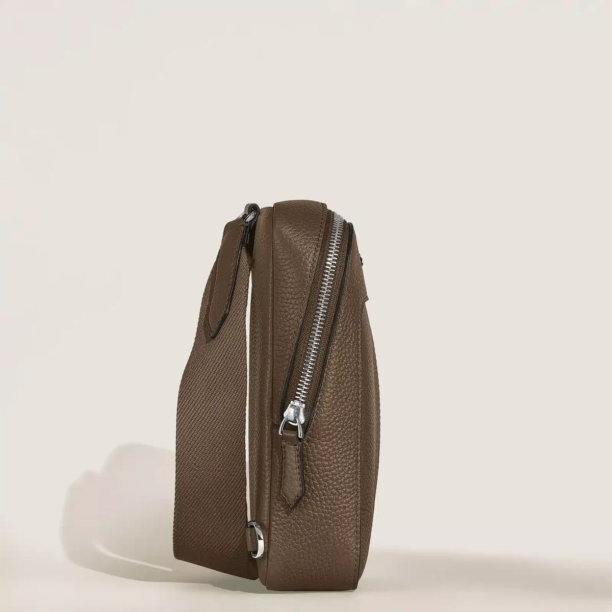 Ce sac de tous les jours est confectionné en cuir grainé noisette souple aux formes douces et élégantes, conçu pour ceux qui apprécient le luxe sans effort et la facilité d’accès. Parfait pour un style décontracté et nomade, il est doté de fermetures éclair en forme de plume et comprend un compartiment principal avec trois fentes pour cartes et une poche ouverte, ainsi qu’une poche extérieure zippée pour les essentiels. Avec sa bandoulière amovible et réglable, ce sac offre un moyen sophistiqué de garder vos effets personnels à portée de main.